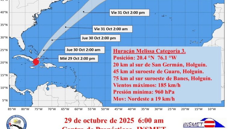 El huracán Melissa abandonó el territorio cubano. Según el Aviso de ciclón tropical número 25 del Insituto de Meteorología de Cuba (Insmet), el núcleo del sistema meteorológico atravesó la provincia de Holguín, donde municipios como Cueto, Mayarí y Banes reportan condiciones de calma en estos momentos, tras la salida del fenómeno al mar por esta […]