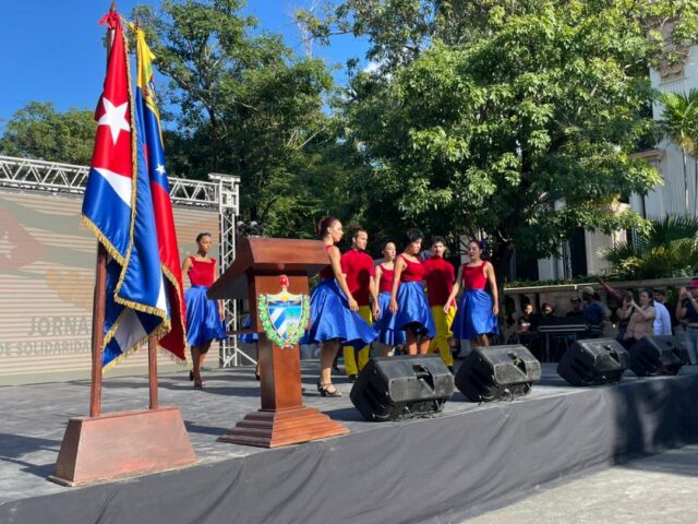 El acto, celebrado en el marco de la Jornada de Solidaridad con Venezuela, contó con la presencia de Bruno Rodríguez Parrilla, miembro del Buró Político del Comité Central del Partido Comunista de Cuba y ministro de Relaciones Exteriores; Teresa Amarelle Boué, también miembro del Buró Político y secretaria general de la Federación de Mujeres Cubanas (FMC); y Orlando Maneiro Gaspar, embajador de Venezuela en Cuba.