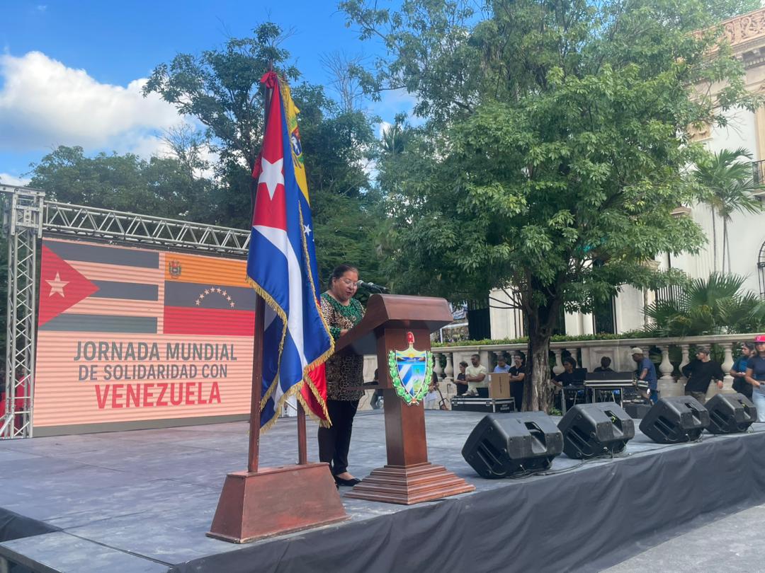 El acto, celebrado en el marco de la Jornada de Solidaridad con Venezuela, contó con la presencia de Bruno Rodríguez Parrilla, miembro del Buró Político del Comité Central del Partido Comunista de Cuba y ministro de Relaciones Exteriores; Teresa Amarelle Boué, también miembro del Buró Político y secretaria general de la Federación de Mujeres Cubanas (FMC); y Orlando Maneiro Gaspar, embajador de Venezuela en Cuba.