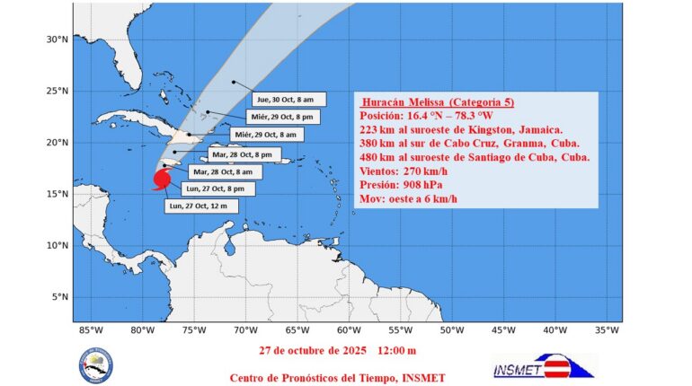 El Centro de Pronósticos del Instituto de Meteorología (Insmet), en su Aviso de Ciclón Tropical No. 12, informó que el huracán Melissa ha continuado ganando intensidad durante las últimas 12 horas, experimentando un proceso de rápida intensificación que lo ha elevado a categoría 4 en la escala Saffir-Simpson, de un máximo de cinco. Melissa presenta […]